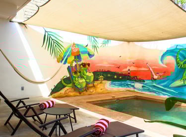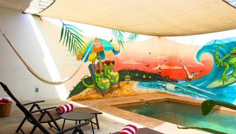 A pocos pasos de la playa y los mercados locales. Escápate del calor en la piscina profunda rodeada del hermoso mural "Gecko Surfista".