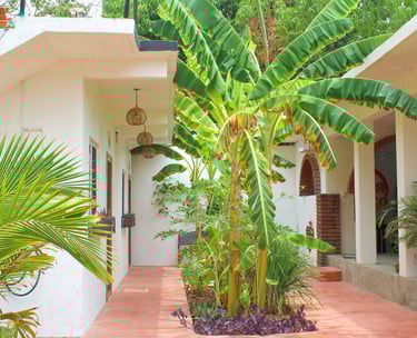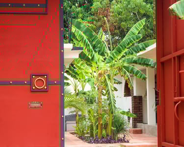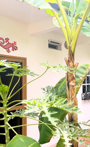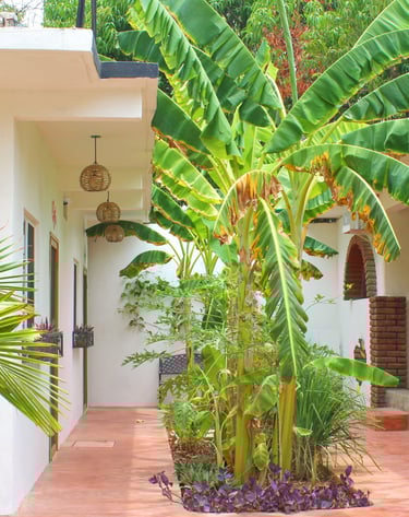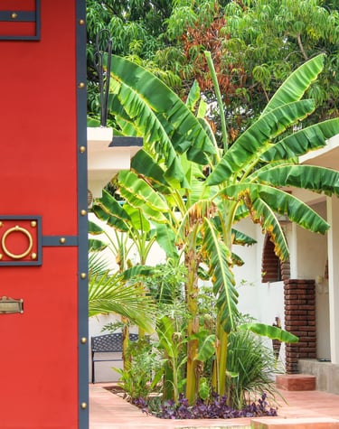 Entra por unas preciosas puertas metálicas y descubre un pequeño y encantador jardín tropical con plantas de limón y árboles frutales de temporada. ¡Recoge tus propios mangos, plátanos y papayas!